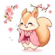 Download and print this funny artwork of a fluffy squirrel in a pink kimono, joyfully spinning with a cherry blossom. Instant joy for your walls.